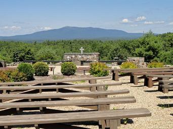 Keywords: new hampshire cathedral of the pines mountains forest trees woods outdoor church benches altar beauty