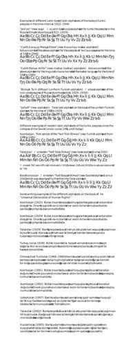 | Keywords: New Turkic alphabets.svg hier <br/>Sonderzeichen Ə Ƣ Gha Ɵ kein großes Theta Ƶ Ƅ kein kleines b Ŋ Ƴ own see below for XeLaTeX source code Postmann Michael SVG by Brian Ammon 2012-05-24 Brian Ammon File New_Turkic_alphabets jpg XeLaTeX source code <syntaxhighlight lang latex > TEX TS-program xelatex TEX encoding UTF-8 Unicode \documentclass12pt a4paper scrartcl \usepackage geometry \geometry a4paper \usepackage fontspec xltxtra xunicode \defaultfontfeatures Mapping tex-text \setromanfontMapping tex-text Linux Libertine O \setsansfontScale MatchLowercase Mapping tex-text Linux Biolinum O \begin document \begin flushleft \subsubsection Examples of different Latin-based latin alphabets of the today's turkic peoples in the time interval 1922--1940 \paragraph Jeni Jol new way The Latin-based output alphabet for turkic the peoples in the Russian Empire Azerbaijan 1922--1929 \newline \Large Aa Bb Cc Çç Dd Ee Əə Ff Gg Ƣƣ Hh Xx İi Jj Kk Qq Ll Mm Nn Oo Ɵɵ Pp Rr Ss Şş Tt Uu Yy Vv Zz Ƶƶ Ƅƅ \paragraph Caññı Karaçaj-Malqar Elible new Karachay-malkar alphabet Advancement of the above alphabet for the peoples of the Caucasus area for the time of 1924 to 1940 \newline \Large Aa Bb Cc Çç Dd Ee Ff Gg Ƣƣ Hh Xx İi Jj Kk Ll Mm Nn Ŋŋ Oo Œœ Pp Qq Rr Ss Šš Tt Uu Vv Xx Yy Zz Ƶƶ Ƅƅ \paragraph Caññı Malxar Alifbi new malkar balkar alphabet Advancement of the above alphabet for the linguistic characteristics of the balkar language for the time of 1924 to 1940 \newline \Large Aa Bb Cc Çç Dd Ee Ff Gg Ƣƣ Hh Xx İi Jj Kk Qq Ll Mm Nn Ŋŋ Oo Ɵɵ Pp Qq Rr Ss Šš Tt Uu Vv Yy Zz Ƅƅ \paragraph Birleşik Türk Əlifbası uniform Turkish alphabet The basic alphabet of the non-slavic peoples of Russia Azerbaijan style 1929--1939 \newline \Large Aa Bb Cc Çç Dd Ee Əə Ff Gg Ƣƣ Hh Xx İi Jj Kk Qq Ll Mm Nn Oo Ɵɵ Pp Rr Ss Şş Tt Uu Yy Vv Zz Ƅƅ \paragraph Jañalif new alphabet Tatar latin alphabet on the basis of the uniform Turkish alphabet for the time of 1929 to 1939 \newline \Large Aa Bb Cc Çç Dd Ee Əə Ff Gg Ƣƣ Hh Xx İi Jj Kk Qq Ll Mm Nn Ŋŋ Oo Ɵɵ Pp Rr Ss Şş Tt Uu Ƴƴ Vv Ww Zz Ƅƅ \subsubsection Different examples of modern latin alphabets of the turkic peoples since the collapse of the Soviet Union since 1991 until today \paragraph Azerbaijan First version of the Yeni Türk Älifbası new Turkish alphabet from 1991 to 1992 \newline \Large Aa Ää Bb Cc Çç Dd Ee Ff Gg Ğğ Hh Xx Iı İi Kk Qq Ll Mm Nn Oo Öö Pp Rr Ss Şş Tt Uu ü Vv Yy Zz \paragraph Tatarstan The modern Yañi Tatar Älifbası new tatar alphabet since 2002 \newline \Large Aa Ää \addfontfeature VerticalPosition Superior 1 Bb Cc Çç Dd Ee Ff Gg Ğğ Hh Xx Iı İi Íí Jj Kk Qq Ll Mm Nn Ññ Oo Öö Pp Rr Ss Şş Tt Uu ü Vv Ww Yy Zz \vspace 0 5\baselineskip \footnotesize \noindent \addfontfeature VerticalPosition Superior 1 The letters Ää were officially introduced in 2002; between 2001 and 2002 the sound was represented by Əə \paragraph Bashkortostan The modern Yañi Başqırt Əlifbası new bashkir alphabet since 2002 which was developed further from the Tatar alphabet \newline \Large Aa Bb Cc Çç Dd Ee Əə Ff Gg Ğğ Hh Xx Iı İi Íí Jj Kk Qq Ll Mm Nn Ññ Oo Öö Pp Rr Ss Şş Tt Uu ü Vv Ww Yy Zz Źź \subsubsection Some writing examples of the different alphabets on the basis of the Universal Declaration of Human Rights \paragraph Azerbaijan 1922 Butun insanlar ləƶaqət və huqyqlarƅna gɵrə azad və bərabər doƣylyrlar Onarƅn şuyralrƅ və vicdanlarƅ var və bir-birlərinə mubasibətdə qardaşlƅq rynhynda davranmalƅdƅrlar \paragraph Azerbaijan 1929 Butun insanlar ləjaqət və huqyqlarƅna gɵrə azad və bərabər doƣylyrlar Onarƅn şuyralrƅ və vicdanlarƅ var və bir-birlərinə mubasibətdə qardaşlƅq rynhynda davranmalƅdƅrlar \paragraph Tatarstan 1929 Barlƅq keşelər də azat həm ƴz abrujlarƅ həm xoquqlarƅ jaƣinnan tiŋ bulƅn tualar Alaraƣa aqƅl həm woclai birelgən həm ber-bersenə qarata tuƣanarça monəsəbəttə bulƅrƣa tieşlər \paragraph Turkey since 1928 Bütün insanlar hür hysiyet ve haklar bakımından eşit doğarlar Akıl ve vicdana sahiptirler ve birbirlerine karşı kardeşlik zihniyeti ile hareket etmelidirler \paragraph Chinese East Turkistan 1969--1980 Hemme adem zanidinla erkin izzet-hörmet we hoquqta bapbarawer bolup tughulghan Ular eqilge we wijdañğa ige hemde bir-birige qərubdasgkuq munasiwitige xas roh bilen muamile qilishi kərek \paragraph Azerbaijan 1991 Bütün insanlar läyaqät vä hüquqlarına göre azad bärabär doğulurlar Onarın şüuralrı vä vicdanları var vä bir-birlärinä mübasibätdä qardaşlıq runhunda davranmalıdırlar \paragraph Azerbaijan 1992 Bütün insanlar ləyaqət və hüquqlarına göre azad bərabər doğulurlar Onarın şüuralrı və vicdanları var və bir-birlərinə mübasibətdə qardaşlıq runhunda davranmalıdırlar \paragraph Uzbekistan 1997 Barcha odamlar ozod xamda teng qadr-qimmat va huquqli boʻlib tugʻiladilar Insonlarga aql va vijdon berilgan va uluar bir-birlariga birodarlarcha munosabatda boʻlishlari lozim \paragraph Tatarstan 2002 Barlıq keşelär dä azat häm üz abruyları häm xoquqları yağınnan tiñ bulıp tualar Alarğa aqıl häm woclaí birelgän häm ber-bersenä qarata tuğanarça monäsäbättä bulırğa tieşlär \paragraph Kazakhstan 2005 Barlıq adamdar tumısınan azat ğäne qadir-qasieti men kuqıqtarı teñ bolıp düniege keledi Adamdarğa aqıl-parasat ar-oğdan berilgen sondiqtan olar bir-birimen tuıstıq bauımaldıq qarım-qatınas ğasauları tïis \end flushleft \end document </syntaxhighlight> Turkic languages Rendered texts in Latin script Latinized scripts in the Soviet Union Turkish language Latin alphabet charts Images with LaTeX source code |