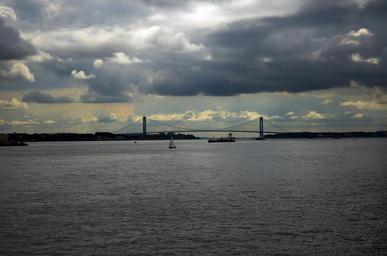 Keywords: new york city bridge river city manhattan ships boats clouds