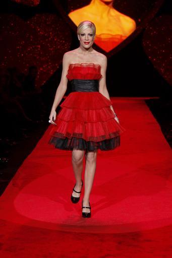Keywords: new york city fashion show model modeling female red dress walking display exhibit collection