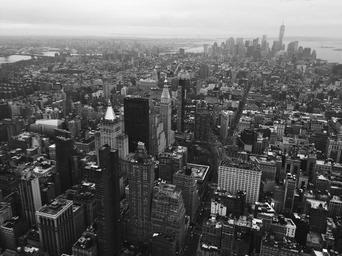 Keywords: new york city nyc downtown aerial urban buildings towers rooftops architecture black and white