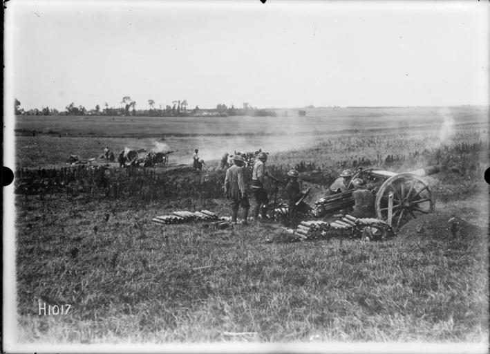 | Keywords: blackandwhite monochrome outdoor black and white A line of New Zealand field guns in action in the French countryside (specific place unidentified) during World War I. Shows the guns at the time of firing. Note the piles of shells around the nearest gun. Photograph taken 8 August 1918 by Henry Armytage Sanders. Inscriptions: Inscribed - Photographer's title on negative -bottom left: H1017. Quantity: 1 b&w original negative(s). Physical Description: Dry plate glass negative 4 x 5 inches New Zealand guns in action in France during World War I. Royal New Zealand Returned and Services' Association :New Zealand official negatives, World War 1914-1918. Ref: 1/2-013583-G. Alexander Turnbull Library, Wellington, New Zealand. natlib.govt.nz/records/22683536 A line of New Zealand field guns in action in the French countryside (specific place unidentified) during World War I. Shows the guns at the time of firing. Note the piles of shells around the nearest gun. Photograph taken 8 August 1918 by Henry Armytage Sanders. Inscriptions: Inscribed - Photographer's title on negative -bottom left: H1017. Quantity: 1 b&w original negative(s). Physical Description: Dry plate glass negative 4 x 5 inches New Zealand guns in action in France during World War I. Royal New Zealand Returned and Services' Association :New Zealand official negatives, World War 1914-1918. Ref: 1/2-013583-G. Alexander Turnbull Library, Wellington, New Zealand. natlib.govt.nz/records/22683536 |