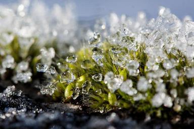 Keywords: new zealand moss winter snow cold transition autumn frozen melted crystals green white transparent nature plant flora