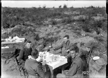 | Keywords: blackandwhite monochrome outdoor black and white New Zealand officers eating breakfast in a trench that until two days previous had been occupied by German forces. Their breakfast included New Zealand butter that had just arrived in a parcel from home. Photograph taken by Henry Armytage Sanders in France or Belgium, 1918. Back of file print reads: `In a trench that two days before this picture was taken was occupied by Germans. Some New Zealand officers have breakfast in the open air - and enjoyed New Zealand butter just arrived in a gift parcel from home in New Zealand.' Quantity: 1 b&w original negative(s). Physical Description: Dry plate glass negative 4.75 x 6.5 inches New Zealand officers eating breakfast in captured German trenches. Royal New Zealand Returned and Services' Association :New Zealand official negatives, World War 1914-1918. Ref: 1/2-013488-G. Alexander Turnbull Library, Wellington, New Zealand. natlib.govt.nz/records/22769333 New Zealand officers eating breakfast in a trench that until two days previous had been occupied by German forces. Their breakfast included New Zealand butter that had just arrived in a parcel from home. Photograph taken by Henry Armytage Sanders in France or Belgium, 1918. Back of file print reads: `In a trench that two days before this picture was taken was occupied by Germans. Some New Zealand officers have breakfast in the open air - and enjoyed New Zealand butter just arrived in a gift parcel from home in New Zealand.' Quantity: 1 b&w original negative(s). Physical Description: Dry plate glass negative 4.75 x 6.5 inches New Zealand officers eating breakfast in captured German trenches. Royal New Zealand Returned and Services' Association :New Zealand official negatives, World War 1914-1918. Ref: 1/2-013488-G. Alexander Turnbull Library, Wellington, New Zealand. natlib.govt.nz/records/22769333 |