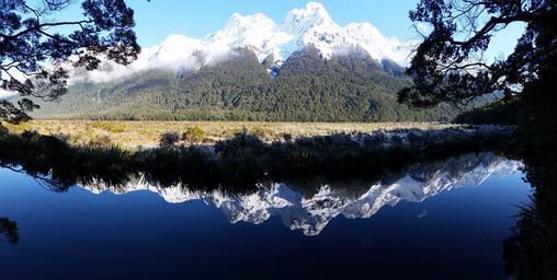 Keywords: new zealand snow mountain landscape sky countryside clouds reflection water