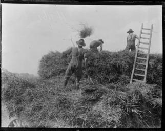 | Keywords: blackandwhite monochrome photo border outdoor black and white New Zealand soldiers use pitch forks to pile hay onto a haystack to help local farmers with the harvest in World War I. Photograph taken 25 August 1917 by Henry Armytage Sanders. Inscriptions: Inscribed - Photographer's title on negative -bottom right: H1161. Quantity: 1 b&w original negative(s). Physical Description: Dry plate glass negative 4 x 5 inches New Zealand soldiers helping with the harvest in World War I. Royal New Zealand Returned and Services' Association :New Zealand official negatives, World War 1914-1918. Ref: 1/2-013710-G. Alexander Turnbull Library, Wellington, New Zealand. natlib.govt.nz/records/23017777 New Zealand soldiers use pitch forks to pile hay onto a haystack to help local farmers with the harvest in World War I. Photograph taken 25 August 1917 by Henry Armytage Sanders. Inscriptions: Inscribed - Photographer's title on negative -bottom right: H1161. Quantity: 1 b&w original negative(s). Physical Description: Dry plate glass negative 4 x 5 inches New Zealand soldiers helping with the harvest in World War I. Royal New Zealand Returned and Services' Association :New Zealand official negatives, World War 1914-1918. Ref: 1/2-013710-G. Alexander Turnbull Library, Wellington, New Zealand. natlib.govt.nz/records/23017777 |