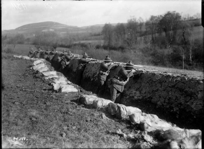 | Keywords: blackandwhite monochrome outdoor black and white Members of the 3rd Battalion New Zealand Rifle Brigade practising rapid rifle fire on the enemy from his own captured trench at a training ground in Henneveux, France. Photograph taken 31 October 1917 by Henry Armytage Sanders. Inscriptions: Inscribed - Photographer's title on negative -bottom left: H311. Quantity: 1 b&w original negative(s). Physical Description: Dry plate glass negative 4.75 x 6.5 inches New Zealand troops undergo rifle training in World War I. Royal New Zealand Returned and Services' Association :New Zealand official negatives, World War 1914-1918. Ref: 1/2-012952-G. Alexander Turnbull Library, Wellington, New Zealand. natlib.govt.nz/records/23114961 Members of the 3rd Battalion New Zealand Rifle Brigade practising rapid rifle fire on the enemy from his own captured trench at a training ground in Henneveux, France. Photograph taken 31 October 1917 by Henry Armytage Sanders. Inscriptions: Inscribed - Photographer's title on negative -bottom left: H311. Quantity: 1 b&w original negative(s). Physical Description: Dry plate glass negative 4.75 x 6.5 inches New Zealand troops undergo rifle training in World War I. Royal New Zealand Returned and Services' Association :New Zealand official negatives, World War 1914-1918. Ref: 1/2-012952-G. Alexander Turnbull Library, Wellington, New Zealand. natlib.govt.nz/records/23114961 |