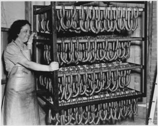 | Keywords: Newberry County, South Carolina. Scene in the sausage room at the P and M Packing Company. Each fra . . . - NARA - 522689.tif Scope and content Full caption reads as follows Newberry County South Carolina Scene in the sausage room at the P and M Packing Company Each frame as shown here holds 150 lbs of sausage Sausage made at this plant is sold in Newberry and surrounding towns General notes 522689 Local identifier 83-G-44569 Department of Agriculture Bureau of Agricultural Economics Division of Economic Information ca 1922 - ca 1953 Still Picture Records Section Special Media Archives Services Division NWCS-S National Archives at College Park 8601 Adelphi Road College Park MD 20740-6001 04/1941 Record group Record Group 83 Records of the Bureau of Agricultural Economics 1876 - 1959 Record group ARC 412 Photographic Prints Documenting Programs and Activities of the Bureau of Agricultural Economics and Predecessor Agencies compiled ca 1922 - ca 1947 documenting the period ca 1911 - ca 1947 Series ARC 521048 File unit File unit ARC Variant control numbers NAIL Control Number NWDNS-83-G-44569 yes Other versions <gallery> File Newberry_County _South_Carolina _Scene_in_the_sausage_room_at_the_P_and_M_Packing_Company _Each_fra_ _ _ _-_NARA_-_522689 tif tif File Newberry_County _South_Carolina _Scene_in_the_sausage_room_at_the_P_and_M_Packing_Company _Each_fra_ _ _ _-_NARA_-_522689 jpg jpg </gallery> NARA-cooperation PD-USGov NARA TIF images with categorized JPGs 1941 in Newberry County |