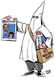 | Keywords: NewYorkPostObamaChimpCartoonCausesOutrage.png en A New York Post cartoon that some have interpreted as comparing President Barack Obama to a violent chimpanzee gunned down by police has drawn outrage from civil rights leaders http //www archive org/details/NewYorkPostObamaCartoonCausesOutrage Creator Carlos Latuff 2009-02-22 Cc-pd 2009 cartoons Caricatures of Barack Obama by Carlos Latuff New York Post Ku Klux Klan political cartoons | ||||