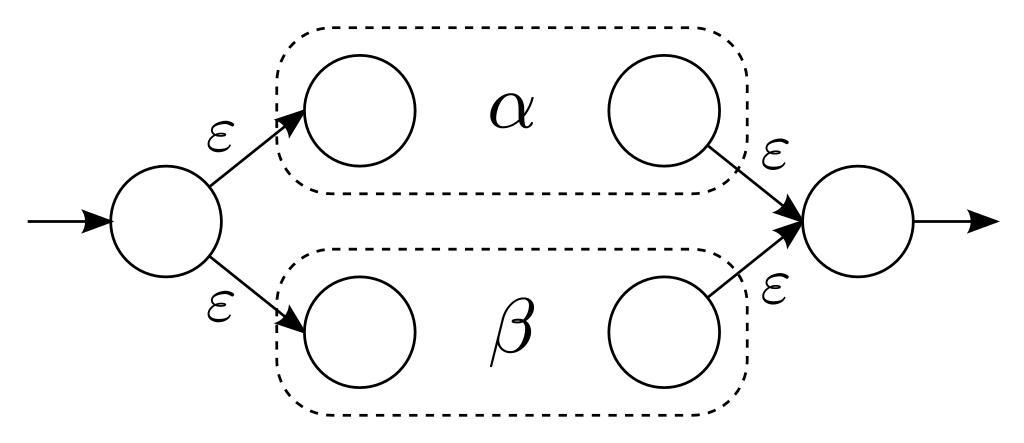 | Keywords: NFA regexp sum.svg en Nondeterministic finite automaton with <math>\epsilon</math>-transition that represents sum of two regular expressions <math>\alpha</math> and <math>\beta</math> <math>\alpha + \beta</math> pl Niedeterministyczny automat skończony z <math>\epsilon</math>-przejściami reprezentujący sumę dwóch wyrażeń regularnych <math>\alpha</math> and <math>\beta</math> <math>\alpha + \beta</math> own Wojciech Muła 11 10 2008 Finite state machine Regex | ||||