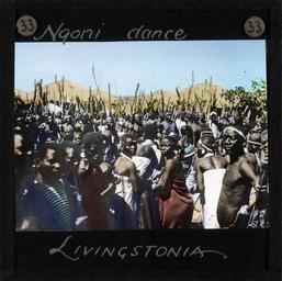 | Keywords: "Ngoni Dance, Livingstonia" Malawi, ca.1895 (imp-cswc-GB-237-CSWC47-LS3-1-033).jpg en <br> Ngoni Dance Livingstonia Malawi ca 1895 Photograph of a large group of Ngoni people The group are tightly packed together and many are dancing Wooden sticks are being held in the air by many of the dancers ; The Ngoni people are an ethnic group living in Malawi Mozambique Tanzania and Zambia Their origins can be traced to the Zulu people of kwaZulu-Natal in South Africa Photographer Unknown Filename imp-cswc-GB-237-CSWC47-LS3-1-033 tif Coverage date circa 1895 Part of collection International Mission Photography Archive ca 1860-ca 1960 Type images Part of subcollection Photographs from the Centre for the Study of World Christianity University of Edinburgh U K ca 1900-ca 1940s Repository name Centre for the Study of World Christianity Archival file impaunpub_Volume7/1419 url Repository address The University of Edinburgh School of Divinity New College Mound Place Edinburgh EH1 2LX United Kingdom Geographic subject country Malawi Format aacr2 1 lantern slide 8 x 8 cm Geographic subject continent Africa Rights Contact the repository for details Part of series Elmslie of the Wild Ngoni LS3/1 Repository email divinity-CSWC ed ac uk Subject lcsh Keyword Manners and customs; Tribes Date created circa 1895 Publisher of the digital version University of Southern California Libraries Subject aat genre group portraits Format aat lantern slides Legacy record ID impa-m68429 Access conditions http //www ed ac uk/schools-departments/divinity/research/centres/world-christianity/collections-resources File GB 237 CSWC47/LS3/1/33 1895 author http //digitallibrary usc edu/cdm/ref/collection/p15799coll123/id/64540 PD-old-70-1923 Magic lantern images Images from USC Digital Library uploaded by Fæ International Mission Photography Archive ca 1860-ca 1960 |