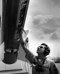| Keywords: monochrome blackandwhite black and white NH 106942. Gunner's Mate Second Class Roberto Aguilar, USN. Gunner's Mate Second Class Aguilar inspects a missile launching control panel on board USS Sterrett (CG-31), circa 1978. Photographer: Claudie Bob Johnson II. U.S. Naval History and Heritage Command Photograph. NH 106942. Gunner's Mate Second Class Roberto Aguilar, USN. Gunner's Mate Second Class Aguilar inspects a missile launching control panel on board USS Sterrett (CG-31), circa 1978. Photographer: Claudie Bob Johnson II. U.S. Naval History and Heritage Command Photograph. |