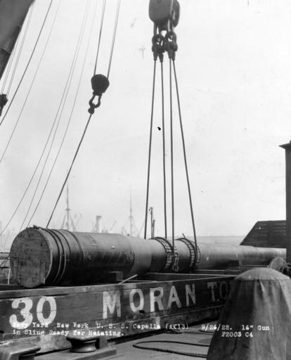 | Keywords: blackandwhite monochrome outdoor black and white NH 42061: Army 16" gun, Model 1919. On board Moran Towing Co. Barge No. 30 on 26 September 1922 in a sling ready to be lifted onto the after deck of USS Capella (AK-13). This was the second of two guns loaded aboard Capella for shipment to Pearl Harbor. Official U.S. Navy Photograph, from the collections of the Naval History and Heritage Command. NH 42061: Army 16" gun, Model 1919. On board Moran Towing Co. Barge No. 30 on 26 September 1922 in a sling ready to be lifted onto the after deck of USS Capella (AK-13). This was the second of two guns loaded aboard Capella for shipment to Pearl Harbor. Official U.S. Navy Photograph, from the collections of the Naval History and Heritage Command. |