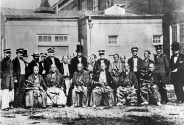 | Keywords: monochrome blackandwhite outdoor team sport sport black and white NH 51119 (complete caption): Japanese Mission to the United States, 1860. Members of the Japanese Treaty Commission pose with officers of the Washington Navy Yard, Washington, D.C., at the time of their arrival at the Yard on 15 May 1860. Those present are (seated, left to right): unidentified Japanese official; Naruse Zenshiro, Governor; Muragaki Awafi no Kami, 2nd Ambassador; Shinmi Buzen no Kami, 1st Ambassador; and Oguri Bungo no Kami, 3rd Ambassador; and Morita Okataro, Officer of the Imperial Treasury. (standing, left to right): Lieutenant Somerville Nicholson, USN; Lieutenant Henry H. Lewis, USN; unidentified man in top hat; Lieutenant David Dixon Porter, USN; Lieutenant Charles C. Simms, USN; Commander William McBlair, USN; four unidentified Japanese; Captain Samuel DuPont, USN, (in top hat); two unidentified Japanese; Captain Franklin Buchanan, USN; two unidentified Japanese; Lieutenant William L. Maury, USN; one unidentified Japanese; Purser Richard T. Allison, USN; and Tsukahava Jungoro, Governor, (in top hat). The unidentified Japanese are probably aides and attendents to the Mission. The photograph looks ESE in the northwestern part of the Navy Yard, on the site of the present Building 104 (which was built several decades later, replacing the structures seen in this view). Collection of Rear Admiral Montgomery M. Taylor, USN. NHHC Photograph Collection. NH 51119 (complete caption): Japanese Mission to the United States, 1860. Members of the Japanese Treaty Commission pose with officers of the Washington Navy Yard, Washington, D.C., at the time of their arrival at the Yard on 15 May 1860. Those present are (seated, left to right): unidentified Japanese official; Naruse Zenshiro, Governor; Muragaki Awafi no Kami, 2nd Ambassador; Shinmi Buzen no Kami, 1st Ambassador; and Oguri Bungo no Kami, 3rd Ambassador; and Morita Okataro, Officer of the Imperial Treasury. (standing, left to right): Lieutenant Somerville Nicholson, USN; Lieutenant Henry H. Lewis, USN; unidentified man in top hat; Lieutenant David Dixon Porter, USN; Lieutenant Charles C. Simms, USN; Commander William McBlair, USN; four unidentified Japanese; Captain Samuel DuPont, USN, (in top hat); two unidentified Japanese; Captain Franklin Buchanan, USN; two unidentified Japanese; Lieutenant William L. Maury, USN; one unidentified Japanese; Purser Richard T. Allison, USN; and Tsukahava Jungoro, Governor, (in top hat). The unidentified Japanese are probably aides and attendents to the Mission. The photograph looks ESE in the northwestern part of the Navy Yard, on the site of the present Building 104 (which was built several decades later, replacing the structures seen in this view). Collection of Rear Admiral Montgomery M. Taylor, USN. NHHC Photograph Collection. |