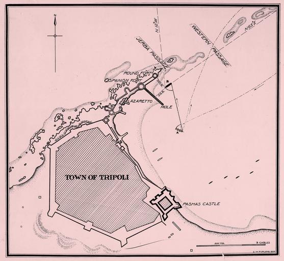 Keywords: sketch drawing cartoon photo border text illustration monochrome writing Burning of the frigate Philadelphia in Tripoli harbor, 16 February 1804. Chart by Charles Wellington Furlong, 1904, depicting (by dot and dash lines) the course followed by the ketch Intrepid, under Lieutenant Stephen Decatur, as she entered and left Tripoli harbor on her mission to destroy the captured USS Philadelphia. Heavy dashed line indicates Philadelphia's drift after she was set afire. Position "A" marks Philadelphia's position when boarded by Decatur's men, while "B" is the location of her wreck when Furlong located it about a century later and recovered artifacts. Position "X" (just west of the Jerba Passage) is the location of Intrepid's wreck after she blew up on 4 September 1804, during another mission into Tripoli harbor. Courtesy of Charles Wellington Furlong, July 1939. NHHC Photograph Collection, NH 56745. Burning of the frigate Philadelphia in Tripoli harbor, 16 February 1804. Chart by Charles Wellington Furlong, 1904, depicting (by dot and dash lines) the course followed by the ketch Intrepid, under Lieutenant Stephen Decatur, as she entered and left Tripoli harbor on her mission to destroy the captured USS Philadelphia. Heavy dashed line indicates Philadelphia's drift after she was set afire. Position "A" marks Philadelphia's position when boarded by Decatur's men, while "B" is the location of her wreck when Furlong located it about a century later and recovered artifacts. Position "X" (just west of the Jerba Passage) is the location of Intrepid's wreck after she blew up on 4 September 1804, during another mission into Tripoli harbor. Courtesy of Charles Wellington Furlong, July 1939. NHHC Photograph Collection, NH 56745. |