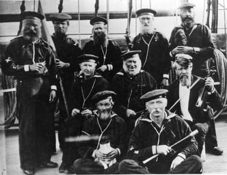 | Keywords: blackandwhite monochrome team sport sport black and white NH 63037: Ten "Old Salts" Photograph taken on board USS Hartford at Hampton Roads, Virginia, winter 1876-77, by order of Chaplain David H. Tribue, USN. The men present are: (Front row, left to right) Seaman James H. Bell and Quartermaster Thomas Trueman; (Second row, left to right) Boatswain's Mate Peter Eagen, Seaman Isaac Turner and Schoolmaster James Connell; (Rear row, left to right) Boatswain's Mate Edward Nash, Boatswain's Mate David Clark, Seaman William McNulty, Quarter Gunner William Harrington and Gunner's Mate Albert Allen. NHHC Photograph Collection. NH 63037: Ten "Old Salts" Photograph taken on board USS Hartford at Hampton Roads, Virginia, winter 1876-77, by order of Chaplain David H. Tribue, USN. The men present are: (Front row, left to right) Seaman James H. Bell and Quartermaster Thomas Trueman; (Second row, left to right) Boatswain's Mate Peter Eagen, Seaman Isaac Turner and Schoolmaster James Connell; (Rear row, left to right) Boatswain's Mate Edward Nash, Boatswain's Mate David Clark, Seaman William McNulty, Quarter Gunner William Harrington and Gunner's Mate Albert Allen. NHHC Photograph Collection. |