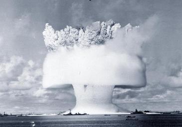 | Keywords: water wave cloud outdoor monochrome sea sky boat vehicle NH 96240: Operation Crossroads, “Baker Day” Underwater Atomic Bomb Test, Bikini Atoll, July 25, 1946. Frame 2 of a series of ground level views, taken about one-and-a-half seconds after detonation. Identifiable ships are, (left to right): USS Pennsylvania; USS New York; USS Salt Lake City; USS Independence; Japanese battleship Nagato; and USS Nevada. NHHC Photograph Collection. NH 96240: Operation Crossroads, “Baker Day” Underwater Atomic Bomb Test, Bikini Atoll, July 25, 1946. Frame 2 of a series of ground level views, taken about one-and-a-half seconds after detonation. Identifiable ships are, (left to right): USS Pennsylvania; USS New York; USS Salt Lake City; USS Independence; Japanese battleship Nagato; and USS Nevada. NHHC Photograph Collection. |