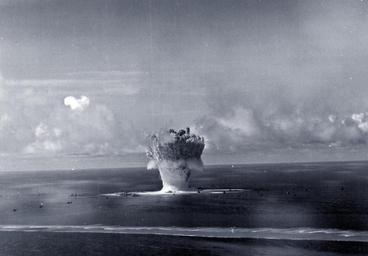 | Keywords: monochrome outdoor NH 96246: Operation Crossroads, “Baker Day” Underwater A-Bomb Test, July 25, 1946. Frame 10 of a series of aerial views, taken from PBM “W” about one second after detonation. Identifiable ships are, (left to right): USS Salt Lake City; USS New York; Nagato (ex-Japanese battleship); USS Nevada; USS Arkansas; USS Saratoga; USS Pennsylvania; and USS Pensacola. NHHC Photograph Collection. NH 96246: Operation Crossroads, “Baker Day” Underwater A-Bomb Test, July 25, 1946. Frame 10 of a series of aerial views, taken from PBM “W” about one second after detonation. Identifiable ships are, (left to right): USS Salt Lake City; USS New York; Nagato (ex-Japanese battleship); USS Nevada; USS Arkansas; USS Saratoga; USS Pennsylvania; and USS Pensacola. NHHC Photograph Collection. |