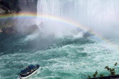 Keywords: niagara falls canada boat rainbow maid of the mist tourists approach waterfall horseshoe falls
