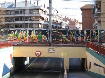 Keywords: Nicasio04.jpg es Mural en la tapia que delimita la vía del ferrocarril de cercanías C-5 en la salida del barrio de San Nicasio Leganés Comunidad de Madrid own Chaluco San Nicasio Leganés Rail transport in Leganés