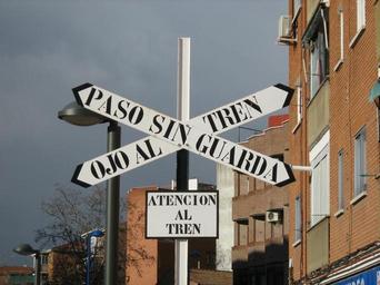 Keywords: Nicasio08.jpg es Señalización del paso a nivel sin barreras del antiguo ferrocarril militar a Cuatro Vientos Situado en el barrio de San Nicasio Leganés Comunidad de Madrid own Chaluco San Nicasio Leganés Rail transport in Leganés