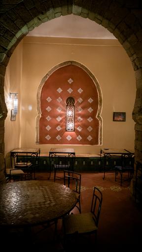 Keywords: niche seating area restaurant dining tables wall decoration light light decoration moorish arabic moroccan wall arch interior design furniture chairs plays of light space old sit wall painting wall decoration morocco casablanca lasquala