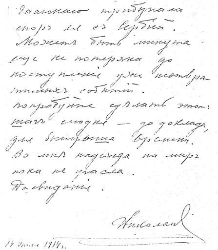 | Keywords: Nicholas II of Russia note 1914-07-14.png en The note from Nicholas II of Russia to his foreign minister S D Sazonov ru Письмо Госуда я Импе ато а иколая II минист у иност анных дел И Д Сазонову от 14 июля 1914 г own Incnis Mrsi date Image Nicholas II of Russia note 1914-07-14 jpg Evidently this is only the note's last page of 2 Text is <blockquote> Гаагскаго т ибунала спо ъ ея съ Се біей ожет быть минута еще не поте яна до наступленія уже неотв атимыхъ событій Поп обуйте сдѣлать этотъ шагъ сегодня до доклада для выиг ыша в емени Во мнѣ надежда на ми ъ пока не угасла До свиданія </blockquote> иколай 14 июля 1914 г World War I origins Nicholas II of Russia Cyrillic manuscripts |
