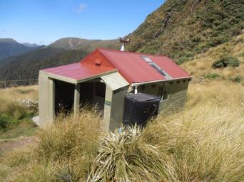 Keywords: Nichols hut 1.jpg Nichols hut W Tararua Range Tararua ; general view with tank 2016-01-06 Own Sarang Nichols Hut