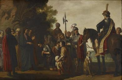 | Keywords: Nicolaes Cornelisz Moyaert - Christ with the Centurion - 2012.84.5 - Minneapolis Institute of Arts.jpg figures in a landscape; Christ at left wearing blue garment accompanied by five figures in various colored robes; three men including one man wearing vest of armor kneeling at center before Christ; man in vest of armor with sword wearing red cape with white fur lining at right seated on horseback accompanied by seated dog; standing armored soldier behind kneeling figures; other standing figures and horse; foliage at left 13 3/4 x 21 1/4 in 34 93 x 53 98 cm sight 20 3/8 x 27 7/8 in 51 75 x 70 8 cm outer frame 2012 84 5 https //api artsmia org/images/113537/5054/large jpg Q1700481 Oil on wood panel Christ with the Centurion https //collections artsmia org/index php page detail id 113537 Q20891799 |