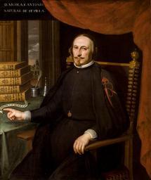 | Keywords: Nicolas Antonio.jpg El erudito sevillano Nicolás Antonio 1617-1684 estudió Artes Liberales en el colegio de Santo Tomás en 1635 pasando luego a Salamanca y Roma De regreso en Sevilla comenzó a redactar su obra más famosa Bibliotheca hispana vetus en 1672 y Bibliotheca hispana nova en 1696 que eran un índice de los escritores españoles desde el emperador Augusto hasta el siglo XVII Y en esta obra aparece vestido con un traje negro y luciendo la cruz roja de la Orden de Santiago en la que el erudito obtuvo un hábito en 1645 por concesión del rey Felipe IV de España Siglo XVIII oil canvas Size cm 104 125 Institution Casa consistorial de Sevilla Vestíbulo de la planta alta de la Casa consistorial de Sevilla http //patrimoniumhispalense com/es/espacio/casa-consistorial/retrato-nicolas-antonio object history exhibition history credit line accession number http //patrimoniumhispalense com/es/espacio/casa-consistorial/retrato-nicolas-antonio PD-old-100 Uploaded with UploadWizard Nicolás Antonio Paintings in the Town hall of Seville Andalusia in the 18th century Domingo Martínez |