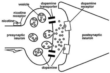 | Keywords: Nicotine increases dopamine release in a synapse.gif en Figure 3 2 Nicotine binds to specific receptors on the presynaptic neuron When nicotine binds to receptors at the cell body it excites the neuron so that it fires more action potentials electrical signals represented by jagged shape in lower left of figure that move toward the synapse causing more dopamine release not shown in figure When nicotine binds to nicotine receptors at the nerve terminal the amount of dopamine released in response to an action potential is increased ~NIH 2013-04-12 09 49 54 http //science education nih gov/supplements/nih2/addiction/guide/lesson3-1 htm United States National Institute of Health PD-USGov Uploaded with UploadWizard Tobacco-related graphics Schizophrenia |