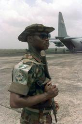 | Keywords: Nigerian Soldier assigned to ECOMOG stand guard.JPEG en A Economic Community Military Observation Group ECOMOG Nigerian Army troop provides security for ECOMOG Mali Army personnel as they come off a United States Air Force C-130E Hercules aircraft assigned to the 86th Airlift Wing out of Ramstein Air Base Germany The Mali Army personnel were transported to Roberts International Airport in Liberia by the United States Military for a six month deployment in support of Operation ASSURED LIFT ASSURED LIFT is a Joint Task Force Operation to provide airlift and other logistical support to West African states that are deploying more than 600 troops to Liberia as part of the region's ongoing peacekeeping mission Most of the inbound West African forces will come from the country of Mali with the Ivory Coast and Ghana also expected to contribute troops 1997-02-20 http //www defenseimagery mil ID 970220-F-PQ557-005 SSGT Paul R Caron USAF Location Roberts International Airport in Liberia PD-USGov Uploaded with UploadWizard ECOMOG 1997 in Liberia |