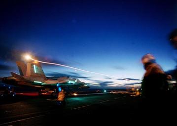 Keywords: night evening aircraft jet fighter take-off men sky clouds ship aircraft carrier us navy outside lights ocean sea sunset beautiful