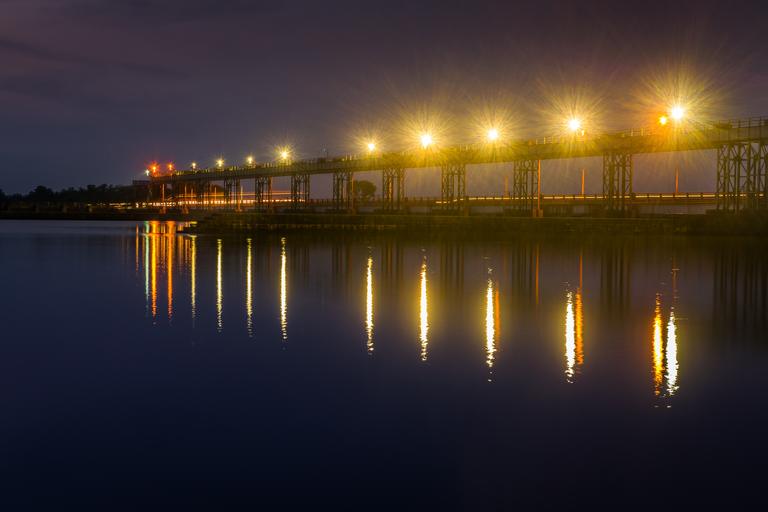 Keywords: night light blue yellow black photo moving interesting perfect picture bridge road sky water reflect cloud dark