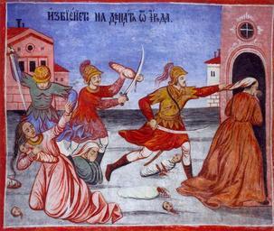 | Keywords: Nikola-Obrazopisov-Belyova-church-Massacre-of-the-Innocents-1869.jpg Избиването на децата от И од стенопис в Бельова цъ ква Mural Massacre of the Innocents in Belyova church Скани ана от икола Иванов Об азописов издание на Самоковския исто ически музей 2009 ISBN 978-954-8623-05-6 Scanned from Nikola Ivanov Obrazopisov edition of Samokov History Museum 2009 ISBN 978-954-8623-05-6 1869 Creator Nikola Obrazopisov Nikola Obrazopisov 1829-1915 PD-old-100 Nikola Obrazopisov Belyova Church Samokov History Museum Frescos of the Massacre of the Innocents Swaddling in paintings |