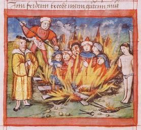 | Keywords: Nikolaus Marschalk fol 103 judenverbrennung sternberg 1492.jpg de https //de wikipedia org/w/index php title Sternberger_Hostiensch C3 A4nderprozess curid 7204795 Judenverbrennung zu Sternberg unter Magnus II 1492 Miniatur 8 7 x 10 1 cm fol 103v In de Nikolaus Marschalk de Mecklenburgische Reimchronik Schweriner Kodex von 1521/23 de Landesbibliothek Mecklenburg-Vorpommern Signatur Ms 376 Text 1 Buch 81 Kapitel überschrieben Wie die Jodenn zum Sternberg vonn eynem priester hernn Peter das heilige Sacrament kaufftenn vnnd marterten vnnd Herzog Magnus sie lies verbornnen Vnnd weiter vonn Herzog Magnus vnnd Herzog Baltasars seynes bruders tode fol 104 cf http //digital ub uni-duesseldorf de/ihd/content/pageview/1597326 Textediton von 1739 In de Ernst Joachim Westphal http //digital ub uni-duesseldorf de/content/titleinfo/1598225 Monumenta inedita rerum Germanicarum Leipzig 1739-45 S 625-626 f Johannes Erichsen Hrsg 1000 Jahre Mecklenburg Rostock 1995 ISBN 3-356-00622-3 S 52 auch abgebildet und beschrieben In Michael Bischof Geschichtsbilder zwischen Fakt und Fabel Nikolaus Marschalks Mecklenburgische Reimchronik und ihre Miniaturen Lemgo 2006 ISBN 3-9807816-3-1 S 126 S 153f 1521/1523 Buchmaler unbekannt Nicolaus Marschalk Sternberg Stake in medieval miniature PD-old |