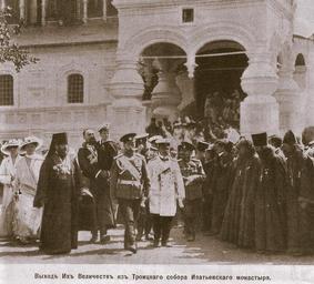 | Keywords: NikolayII Ipatievsky monastery.jpg en Nikolay II in Ipatiev Monastery 1913 ru РО А ОВСКИЕ ТОРЖЕСТВА Жу нал « ива» 24 за 1913 год П ослушав богослужение в Т оицком собо е Их Величества посетили находящиеся внут и Ипатьевского монасты я Палаты в кото ых жили во в емя смутного в емени а фа Ивановна Романова с юным ихаилом Федо овичем В этот же день состоялось Высочайшее посещение кост омского Романовского музея и Дво янского соб ания Соп овождаемые восто женными п иветствиями и кликами на ода Их Величества оставили соб ание и возв атились на па оход Кост ома до глубокой ночи сияла блестящей иллюминацией Улицы и площади были полны на ода жу нал ива 24 за 1913 год К Булла 1913 PD-old Ipatiev Monastery |