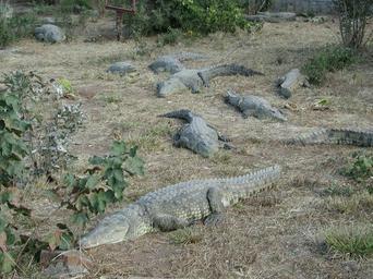| Keywords: Nilkrokodile.jpg This image was copied from wikipedia de The original description was Nilkrokodile Crocodylus niloticus Quelle http //www fourmilab ch/images/eclipse_2001/africaimages html This document is in the public domain A few kilometres on the Zambian side of the Zimbabwe/Zambia border at Victoria Falls is a crocodile ranch The owners raise Nile Crocodiles Crocodylus niloticus commercially for leather and meat at a larger facility elsewhere in Zambia but this is purely a tourist attraction which exhibits mischievous problem crocodiles removed from the Zambezi river Although called the Nile Crocodile the species is found in rivers and swamps throughout non-arid regions of Africa Some of the crocs here are huge--up to five metres in length You can get quite close to the crocodiles on elevated walkways which criss-cross the facility The Sun was out when we visited and most of the crocodiles were basking in the fields There are large pools of water and it is extremely spooky to see how an enormous crocodile can simply disappear as it glides in and sliently submerges Swimming in the Zambezi is an extraordinarily poor idea; if you manage to evade the crocodiles you'll probably be killed by a hippopotamus John Walker 1 date/time username edit summary ---- 19 03 20 Aug 2005 84 191 207 49 <nowiki> revert Vandalismus </nowiki> ---- 14 10 19 Apr 2005 83 65 125 98 <nowiki></nowiki> ---- 06 30 29 Jan 2005 APPER <nowiki></nowiki> ---- 17 01 14 Apr 2004 Head <nowiki></nowiki> ---- 17 00 14 Apr 2004 Head <nowiki> Nilkrokodile </nowiki> Crocodylus niloticus captive Reptiles of Zambia |