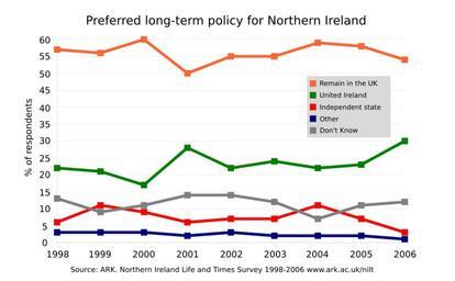 | Keywords: Nilt-Political Attitudes-NIRELAND-2006.svg en wikipedia 2012 January 12 Chart showing responses to the question Do you think the long-term policy for Northern Ireland should be for it i Remain part of the United Kingdom ii Reunify with the Republic of Ireland iii Independent State iv Other v Don't Know in the Northern Ireland Life and Times Survey 1998-2006 Source ARK http //www ark ac uk/nilt Transferred from http //en wikipedia org en wikipedia; transferred to Commons by User FSII using http //tools wikimedia de/~magnus/commonshelper php CommonsHelper 2007-07-22 Original uploader was Duncan Keith at http //en wikipedia org en wikipedia Released into the public domain by the author en wikipedia Duncan Keith Original upload log page en wikipedia Nilt-Political_Attitudes-NIRELAND-2006 svg 2007-07-22 09 01 Duncan Keith 536×331× 95840 bytes <nowiki>Chart showing responses to the the question Do you think the long-term policy for Northern Ireland should be for it i Remain part of the United Kingdom ii Reunify with the Republic of Ireland iii Independent State iv Other v Don't Know in t</nowiki> Northern Ireland Diagrams |