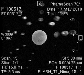 | Keywords: NIMA 2A2B3A3B13.png en A FLASH T1W image of a research phantom at 7T The ghosting artifacts seen in the image are due to Chemical Shifting Chemical Shifting happens in the FE direction The phantom contained a mixture of fat and water Chemical shifting causes a seemingly duplicate copy to appear in the Frequency Encoding direction as seen here with the spots The central cavity contained 95 water 5 Acetic Acid own Zereshk own Zereshk Magnetic resonance imaging | ||||