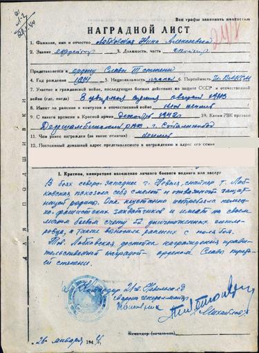 Keywords: Nina Lobkovskaya's 3rd class Order of Glory commendation list.jpg ru Π Π°Π³Ρ Π°Π΄Π½ΠΎΠΉ Π»ΠΈΡΡ ΠΠΎΠ±ΠΊΠΎΠ²ΡΠΊΠΎΠΉ Π ΠΈΠ½Ρ ΠΠ»Π΅ΠΊΡΠ΅Π΅Π²Π½Ρ r ΠΡ Π΄Π΅Π½e Π‘Π»Π°Π²Ρ III ΡΡΠ΅ΠΏΠ΅Π½ΠΈ en Commendation list of Nina Lobkovskaya for her Order of Glory 3rd Class 1944-01-26 http //www podvignaroda ru/ id 19316339 tab navDetailDocument podvignaroda ru ΠΠΎΠ»ΠΊΠΎΠ²Π½ΠΈΠΊ Π ΠΈΡ