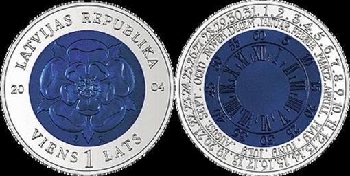 | Keywords: Niob.gif Coin of Time - 1 Lats 2004 Weight 17 15 g weight of the central circle - 7 15 g weight of the outer ring - 10 00 g Diameter 34 mm diameter of the central circle - 23 mm Metal the central circle - niobium; the outer ring - silver fineness 900 Quality UNC Artists Laimonis Senbergs graphic design Janis Strupulis plaster model Obverse A symbol of a heraldic rose with letters H and R beneath it is placed in the central part of the coin The inscription LATVIJAS REPUBLIKA Republic of Latvia is arranged in semicircle at the top of the outer ring the inscription of the divided year 2004 is situated on the left and right from the coin's center and beneath it there is the semicircular inscription VIENS 1 LATS ONE 1 LATS Reverse The reverse of the coin features the dial of the clock with indications of hours and minutes in the central part and the names of months and the dates in the outer ring Edge Plain 2004 Coin The Bank of Latvia <br>Photo own Coin The Bank of Latvia<br> Photo UrSuS Coin Latvian coins Photo Commemorative coins of Latvia Niobium |