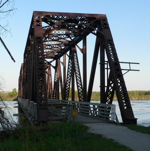 | Keywords: Niobrara State Park bridge from NW 1.JPG  Niobrara River Bridge near the mouth of the Niobrara in Knox County Nebraska ; seen from the northwest The bridge was built in 1929 to carry the Chicago and North Western Railroad across the Niobrara immediately upstream from its confluence with the Missouri It consists of three rigid-connected Warren through truss spans at the west end then seven steel plate through girders then 29 timber stringer approach spans over the floodplain to the east It is now a part of Niobrara State Park where it serves as a footbridge The bridge is listed in the National Register of Historic Places In the photo downstream is left own Ammodramus 2010-05-08 Pictures by Ammodramus Taken with Panasonic Lumix DMC-FZ20 Niobrara State Park bridge  |
