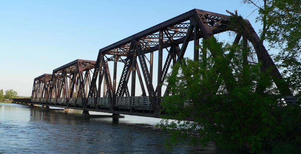 | Keywords: Niobrara State Park bridge from NW 2.JPG Niobrara River Bridge near the mouth of the Niobrara in Knox County Nebraska ; seen from the northwest downstream The bridge was built in 1929 to carry the Chicago and North Western Railroad across the Niobrara immediately upstream from its confluence with the Missouri It consists of three rigid-connected Warren through truss spans at the west end then seven steel plate through girders then 29 timber stringer approach spans over the floodplain to the east It is now a part of Niobrara State Park where it serves as a footbridge The bridge is listed in the National Register of Historic Places own Ammodramus 2010-05-08 Pictures by Ammodramus Taken with Panasonic Lumix DMC-FZ20 Niobrara State Park bridge |