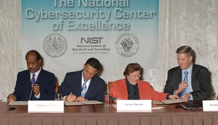 | Keywords: NIST Launches New Collaborative Center for Cybersecurity.jpg NIST in the New National Cybersecurity Center of Excellence At the Memorandum of Understanding Signing Feb 21 from left to right Montgomery County Executive Isiah Leggett Maryland Lt Governor Anthony Brown U S Senator for Maryland Barbara Mikulski and Under Secretary of Commerce for Standards and Technology and NIST Director Patrick Gallagher http //diversifiedtechsolutions com Diversified tech solutions See also http //www nist gov/itl/csd/nccoe-022112 cfm www nist gov/itl/csd/nccoe-022112 cfm 2012-02-21 https //www flickr com/photos/usnistgov/6774265866/ National Institute of Standards and Technology other versions PD-USGov National Institute of Standards and Technology |