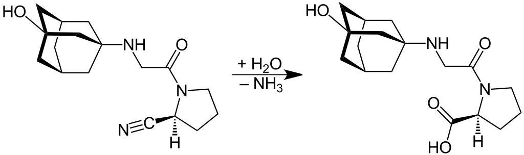 Keywords: Nitril Hydrolysis V.1.svg en Nitril_Hydrolysis de Nitril_Hydrolyse own Jü 12/03/2011 Vildagliptin metabolism Cc-zero Metabolism Chemical reactions
