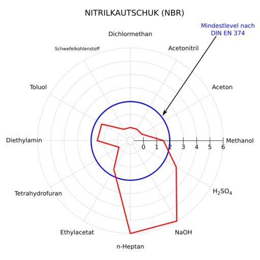 | Keywords: Nitrilkautschuk-Spinne.svg Spinnendiagramm Beständigkeit von Nitrilkautschuk-Schutzhandschuhen Glove Selection NBR Own after http //www dguv de/dguv/medien/ifa/de/pra/chemikalienschutzhandschuhe/pdf/nitril pdf 2015-01-23 Kopiersperre code by StefanPohl PD-own Inkscape gnuplot reset set term svg size 700 700 fname 'Verdana' fsize 12 set size square 9 set lmargin at screen 15 set tmargin at screen 9 set angles degrees unset key set key outside top right unset border set polar set rtics 0 0 1 1 2 2 3 3 4 4 5 5 6 6 7 set rrange 1e-2 7 unset xtics unset ytics set grid polar 30 lt 1 lc 0 lw 0 3 set_label x text sprintf set label ' s' at 8 cos f 8 sin f center text x x eval set_label 0 Methanol 1 5 eval set_label 30 Aceton 0 eval set_label 60 Acetonitril 0 eval set_label 90 Dichlormethan 0 eval set_label 120 Schwefelkohlenstoff 0 eval set_label 150 Toluol 1 5 eval set_label 180 Diethylamin 1 5 eval set_label 210 Tetrahydrofuran 0 eval set_label 240 Ethylacetat 1 5 eval set_label 270 n-Heptan 6 eval set_label 300 NaOH 6 eval set_label 330 H2SO4 3 set output 'nitril svg' plot - u 1 2 t Nitrilkautschuk w l lt 1 lw 3 lc rgb 0xFF0000 0 2 5 30 1 60 1 90 1 120 1 150 2 5 180 2 5 210 1 240 2 5 270 7 300 7 330 4 360 2 5 e unset output Chemical resistance diagrams |