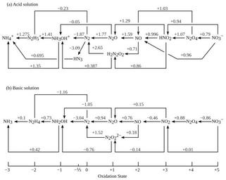 MAKE A MEME View Large Image Nitrogen electrode potentials.svg en Shows the oxidation states of nitrogen and summarizes standard reduction potentials in volts Top diagram shows acid solution at pH 0; bottom shows basic solution at pH 14 Vector version of diagram from ...