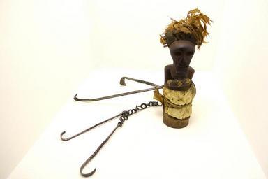 | Keywords: Nkishi, Democratic Republic of the Congo, Songye, 19th or early 20th century, wood, lizard and snake skin, rafia, tissue, iron, metal - Ethnological Museum, Berlin - DSC02249.JPG en Exhibit in the Ethnological Museum Berlin Germany Photography was permitted in the museum without restriction 2014-11-11 11 31 04 own Daderot other versions cc-zero Art of the Democratic Republic of the Congo in the Ethnological Museum Berlin Uploaded with UploadWizard | ||||
