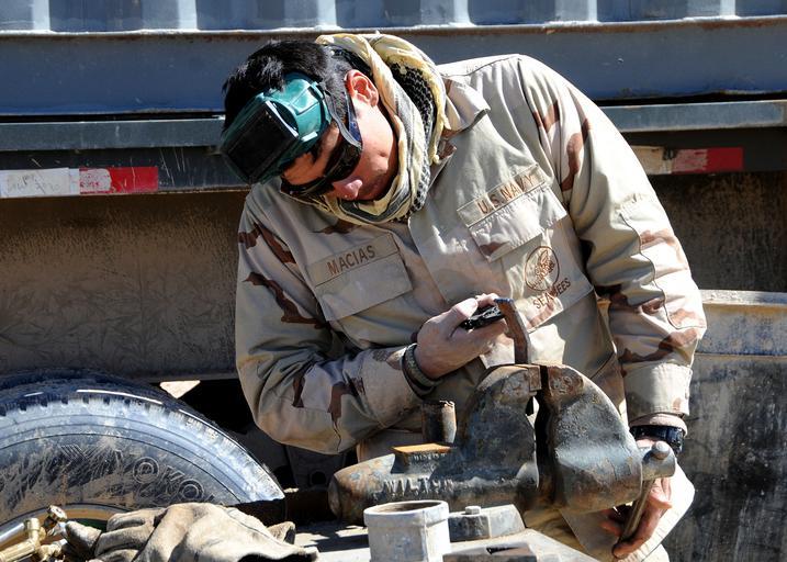 Keywords: NMCB 7 at Forward Operating Base Mescall 120229-N-SD610-007.jpg en Steelworker Constructionman Adrian Macias assigned to Naval Mobile Construction Battalion 7 ™s Water Well Detachment fabricates metal to repair a broken ladder at Forward Operating Base Mescall NMCB 7 and its detachments are one of two Seabee battalions conducting contingency construction and deconstruction in support of the International Security Assistance Force as part of Task Force Stethem operating in the U S Central Command area of operation 2012-02-29 Chief Petty Officer Yan Kennon https //www dvidshub net/image/535669 120229-N-SD610-007 2012-03-05 22 36 ZABUL PROVINCE AF PD-USGov-Military-Navy Zabul Province Images from DoD uploaded by Fæ |